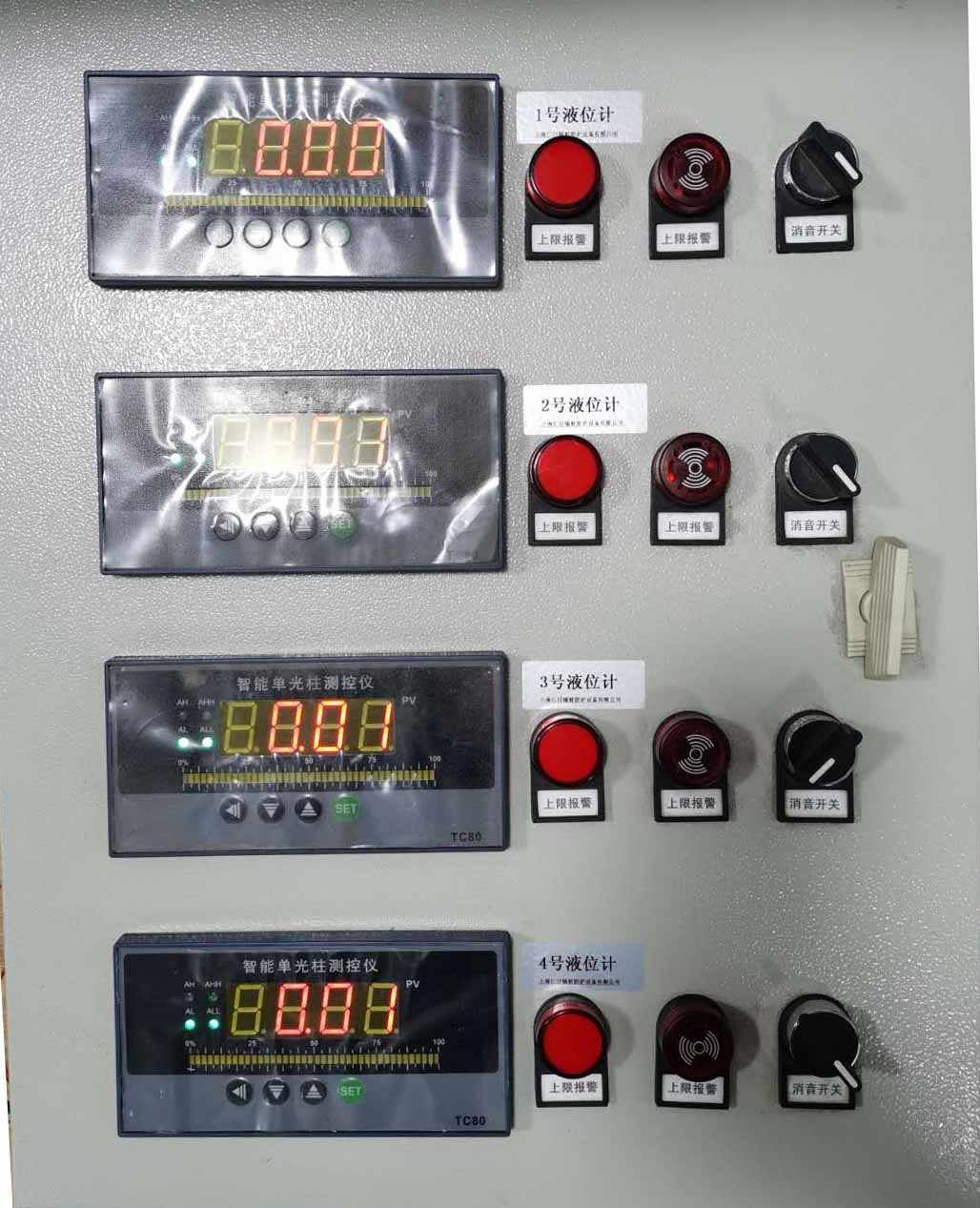 控制柜內(nèi)部嵌入有多個液位變聲器控制主機,該主機能實時采集液位變送器的數(shù)據(jù),并更加設(shè)定的報警閾值給出 上下限閾值聲光報警的功能